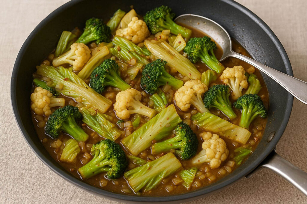 1 kleiner Chinakohl, 200 g Blumenkohlröschen, 200 g Brokkoliröschen, 1 kleine Zwiebel, 2 Knoblauchzehen, 2 EL Pflanzenöl (oder Sesamöl für asiatischen Geschmack), 100 ml Gemüsebrühe, 2 EL Sojasauce, 1 TL Honig oder Ahornsirup, Salz & Pfeffer